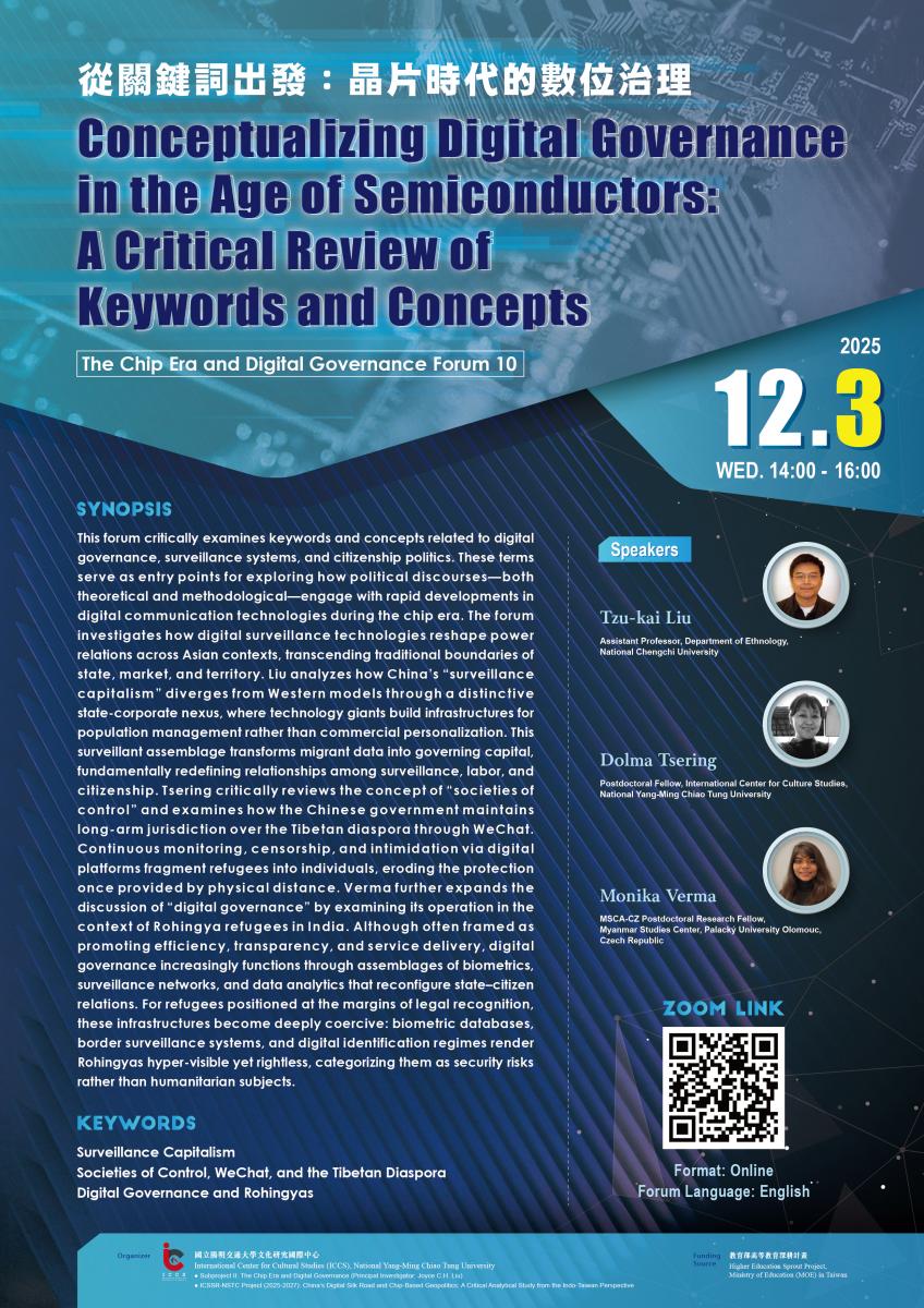 This forum critically examines keywords and concepts related to digital governance, surveillance systems, and citizenship politics. These terms serve as entry points for exploring how political discourses—both theoretical and methodological—engage with rapid developments in digital communication technologies during the chip era. The forum investigates how digital surveillance technologies reshape power relations across Asian contexts, transcending traditional boundaries of state, market, and territory. Liu analyzes how China’s “surveillance capitalism” diverges from Western models through a distinctive state-corporate nexus, where technology giants build infrastructures for population management rather than commercial personalization. This surveillant assemblage transforms migrant data into governing capital, fundamentally redefining relationships among surveillance, labor, and citizenship. Tsering critically reviews the concept of “societies of control” and examines how the Chinese government maintains long-arm jurisdiction over the Tibetan diaspora through WeChat. Continuous monitoring, censorship, and intimidation via digital platforms fragment refugees into individuals, eroding the protection once provided by physical distance. Verma further expands the discussion of “digital governance” by examining its operation in the context of Rohingya refugees in India. Although often framed as promoting efficiency, transparency, and service delivery, digital governance increasingly functions through assemblages of biometrics, surveillance networks, and data analytics that reconfigure state–citizen relations. For refugees positioned at the margins of legal recognition, these infrastructures become deeply coercive: biometric databases, border surveillance systems, and digital identification regimes render Rohingyas hyper-visible yet rightless, categorizing them as security risks rather than humanitarian subjects.