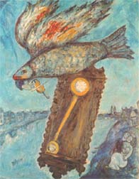 name: Jane 483200730 English Dept. Junior Year comment: Chagall, "Le Temps N'a Point de Rives" This picture is a combination of different images. First the fish has a wing and further more it carries a clock stand in its claws, and a guitar in its beak. The fish is colorful and the color also resembles same to the clock and the guitar. Below it seems to be a river and side it has some tall building and also besides the fish their seem to lie a woman like almost dead. The color of the water and the sky seems to be the same bright color. So, this picture gives me a feeling of happiness and total control by the fish.