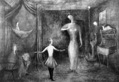 name: 英 四 何 若 君 482200123 comment: Carrington, "Night Nursery Everything" The maternal association of night(moon) is a contrast to the paternal association to the sun. The painting presents a woman and a young girl, and the composition itself shows the close relationship of the two. The connect-i on of their eyesight and their gestures show mutual caring and trust, althought we do not really see thier eyes, it can be imply by the direction their heads turn. The woman's tall image imply her protective position and her power and ability of nursery and protection. The tall woman might be the goddess of night, and the little girl could be Carrington herself or her projection of all the women who were oppressed or confined in the daylight, which symolized the paternal society, and were seeking comfort from the maternal night.