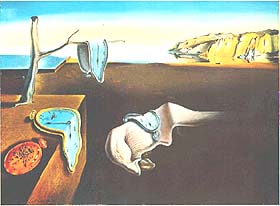 「記憶的執著」 ("The Persistence of Memory") 這幅畫中, 鐘錶堅硬的表殼 成為柔軟的布片, 吊掛在 植於水泥方形體 表面的枯枝上。 時間與記憶的 抽象觀念, 此處以 可摺疊扭曲的布片 具像地呈現。