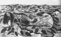 name: English Department, Junior, Karen Huang, 483200376 comment: Kahlo, "Roots" 4/11/1997 It seems to me that the woman is trapped in the painting by roots that she is unable to move or escape. The roots here may represent the rules or tradition that restrain women and force women to keep quiet all the time. Furthermore, the place where the woman lies are very muddy. The mud makes the woman to stay in the same position, in other words, it forces wowen to walk fast or far away from the world which men are in charge of. name: Senior Nicole Wu 482200599 comment: Kahlo, "Roots" 31, April, 1997 為什麼許多畫家筆下,總會把"女人"和"植物"聯結起來?究竟這兩者 之間有何關聯性呢?Kahlo的"Roots"讓我不禁聯想到"大地之母", 不論是史前文化或是某些原住民文化中,特別是以女性為主的母系 社會體系下,認為大地萬物是由一位特別的女性所孕育而成的, Kahol 的靈感是否來自於此,我們不得而知.但我認為由於植物能夠 生長,開花結果,繁衍生命,一如女人和男人生理上最大不同點,即在 於女人有繁衍後代的 能力,因此女人與植物常被相提並論.若如此, Kahlo可說是替女人的 "功能性"下了一番註解.