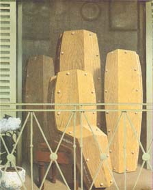 name: English, Junior, Karen Huang, 483200376 comment: Magritte, "Perspective II: Manet's The Balcony'" 1997.3.4 The balcony is supposed to be a space that we can get in touch with the outside world. However, this balcony seems to separate the connection between the house and the outter world for we can't see what's the scenery around the house. Furthermore, the chairs look like mummy's coffins. The coffins give the painting the atmosphere of mystery. It seems that there is some secret hidden inside the coffins. ame: English dept. Erica Guo 483200479 comment: Magritte, "Perspective II: Manet's The Balcony'" 圖中的木箱就像一具具的棺材,其中一具像人般地坐 在椅子上,象徵著人如行屍走肉般生活著,同時也被拘束 囚禁在柵欄內.後方黑牆似乎也代表著這是一個永不被 人發現的角落. name: 英文三 Joanne Hsieh 483200534 comment: Magritte, "Perspective II: Manet's The Balcony'" March 9th 陽台上原本應該坐的是人,但此時看到的卻是一群 類似棺材的東西.與人一種死氣沉沉,又蠻好笑的感覺. name: English Dept/Junior/Rebecca Chan/483200687 comment: Magritte, "Perspective II: Manet's The Balcony'" 07/03/1997 The picture will form the happy atmosphere if those coffins are replaced by a family. On the contrary, it only makes me frightened when I see these four coffins. The whole family cannot escape from death and their destinies are the same. The clock behinds those coffins reminds me that man must leave the world if they are destined to death, no matter they are young or old. Although they are dead, they are still bounded by many rules in the society; thus, the balcony are put in front of those coffins. front of them. name: 英三 蘇美靜 483200091 comment: Magritte, "Perspective II: Manet's The Balcony'" March 7,1997 Through my own imagination, this scene could be a happy family who pleasantly rest themselves by looking outside from the balcony.However, what seems to be weird is that each of them looks like coffin. In this case, I seem to smell certain gloomy atmosphere. name: Junior, Brenda Liu, 483200663 comment: Magritte, "Perspective II: Manet's The Balcony'" 神秘以及畫中沒有任何"動"的意象以及前面的欄杆 似乎充滿著防衛性. name: June 483200704 英文三 comment: Magritte, "Perspective II: Manet's The Balcony'" 3/6/97 In the balcony, Rene Magritte didn't use the faces or bodies of man, where father, mother, children or even grandparents in it. Instead, Magritte used 4 boxes of coffin to expressed the grief and sadness in a family. All the members of the family intend to escape from this kind of family as Magritte place them outside the balcony, where every member are facing on the open air. Nevertheless, they were captured by the rods before them. The painter also placed a white flower beside them as if they are lamenting for a certain kind of grief in their life.