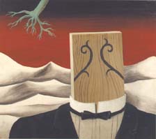 這幾種物體的奇異組合, 似乎把沒有色彩、 沒有生命力的大地、 血色氾濫的天空、 斫傷的樹木, 與沒有面孔、沒有頭腦、沒有人性的「紳士」做無理性的 拼貼與重疊, 而強制產生 某種因果關係。 「征服者」 的沒有人性, 導致大地的死亡。