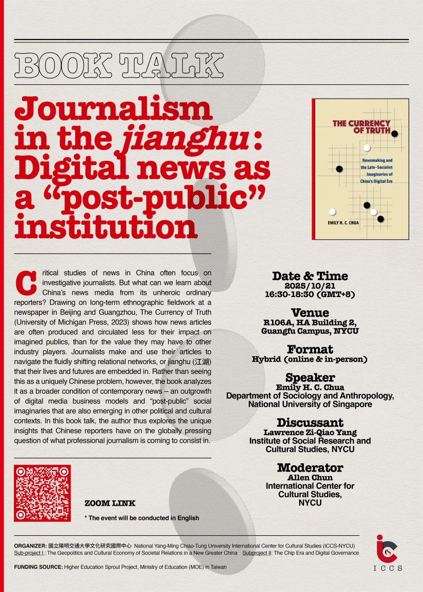 Critical studies of news in China often focus on investigative journalists. But what can we learn about China’s news media from its unheroic ordinary reporters? Drawing on long-term ethnographic fieldwork at a newspaper in Beijing and Guangzhou, The Currency of Truth (University of Michigan Press, 2023) shows how news articles are often produced and circulated less for their impact on imagined publics, than for the value they may have to other industry players. Journalists make and use their articles to navigate the fluidly shifting relational networks, or jianghu (江湖) that their lives and futures are embedded in. Rather than seeing this as a uniquely Chinese problem, however, the book analyzes it as a broader condition of contemporary news – an outgrowth of digital media business models and “post-public” social imaginaries that are also emerging in other political and cultural contexts. In this book talk, the author thus explores the unique insights that Chinese reporters have on the globally pressing question of what professional journalism is coming to consist in.