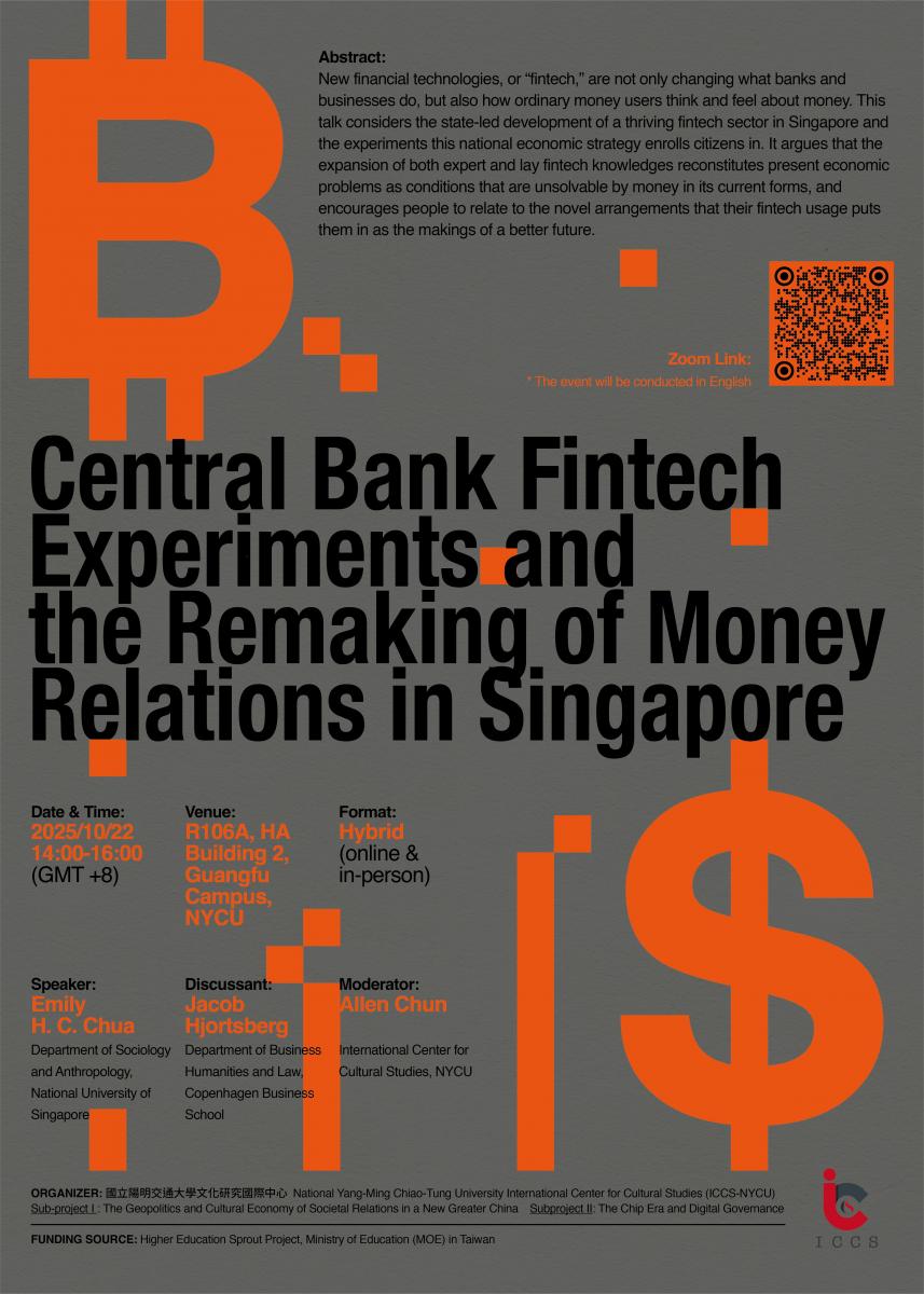 New financial technologies, or “fintech,” are not only changing what banks and businesses do, but also how ordinary money users think and feel about money. This talk considers the state-led development of a thriving fintech sector in Singapore and the experiments this national economic strategy enrolls citizens in. It argues that the expansion of both expert and lay fintech knowledges reconstitutes present economic problems as conditions that are unsolvable by money in its current forms, and encourages people to relate to the novel arrangements that their fintech usage puts them in as the makings of a better future.